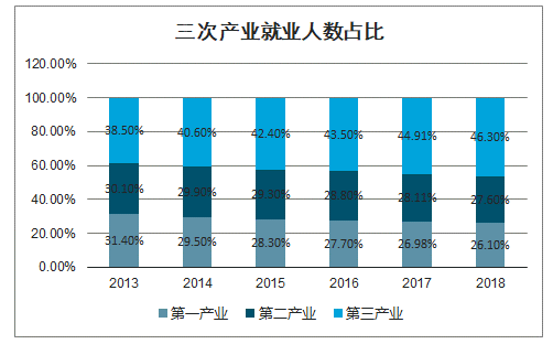 2020年1月,人力資源和社會(huì )保障部黨組在《如何看待我國就業(yè)形勢》一文中稱(chēng),2018年末全國就業(yè)人員總量達7.76億人,第三產(chǎn)業(yè)吸納就業(yè)能力顯著(zhù)增強,三次產(chǎn)業(yè)就業(yè)人數占比從2013年的31.4%/30.1%/38.5%,調整為2018年的26.1%/27.6%/46.3%。我國倒經(jīng)濟塔型的就業(yè)結構已形成,服務(wù)業(yè)就業(yè)人數占比正在持續優(yōu)化中。